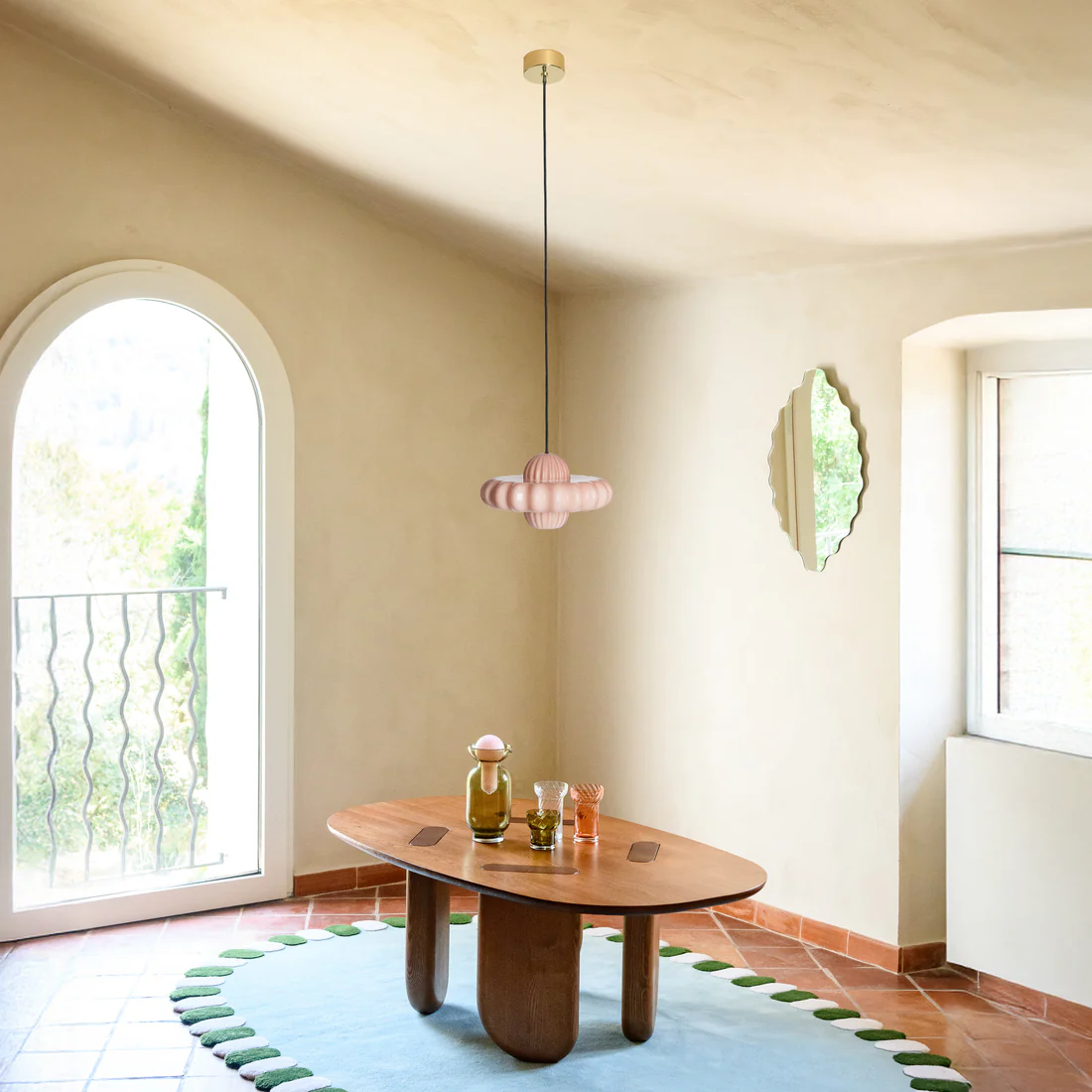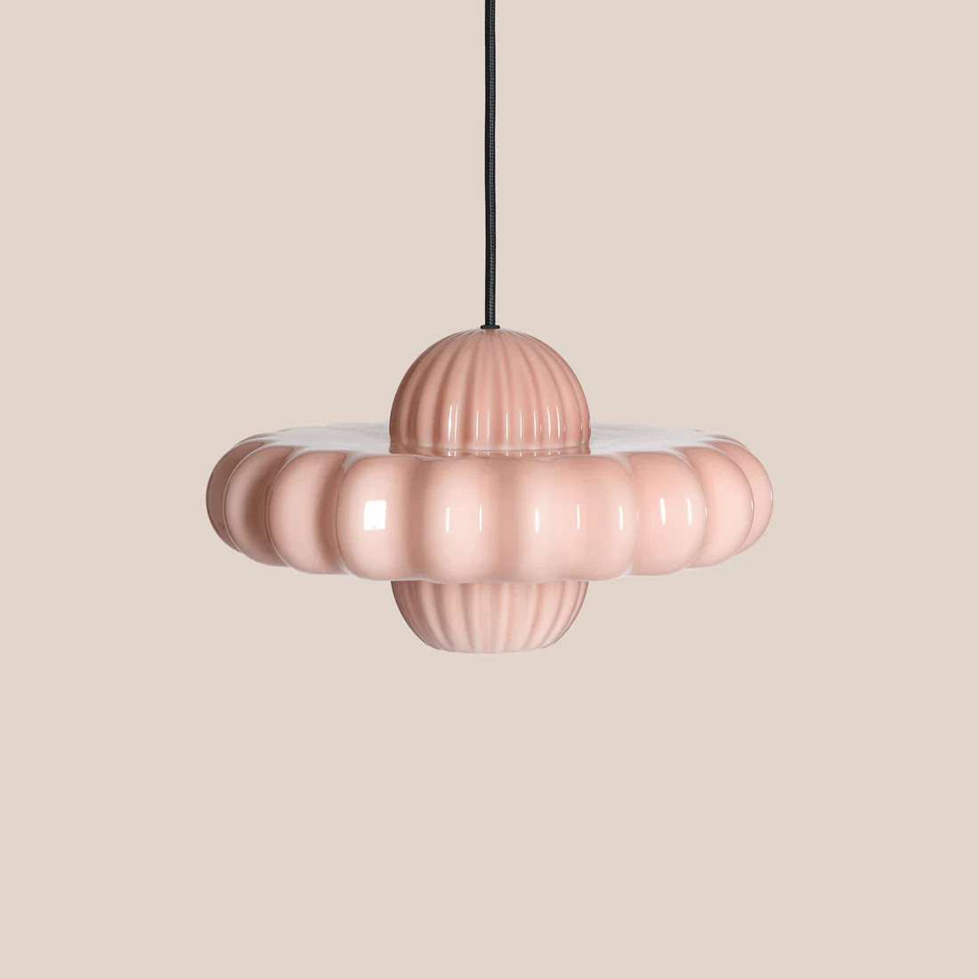 Toupi est une suspension en verre soufflé à la bouche. Elle s’inspire de la silhouette légère et évidente de la toupie, un objet que je collectionne et affectionne depuis longtemps, et dont je trouve la présence à la fois joyeuse et comme une douce métaphore de nos quotidiens qui tournoient. Ses courbes vibrantes semblent flotter dans l’air, comme en équilibre, diffusant une lumière douce et apaisante qui habille l’espace avec grâce. Toupi compose des jeux de volumes et de couleurs qui rythment la pièce avec poésie.